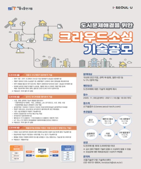 이번 크리우드소싱 기술공모의 과제는 서울특별시의 수요부서에서 개선과 해결이 필요한 분야를 선정하여 제시했으며 서울시 수도계량기 동파방지 기술, 상수도 모니터링용 멀티센서 기술, 제물포터널 통행료 미정산 차량 요금징수 방법(또는 기술) 등의 3가지 이다.