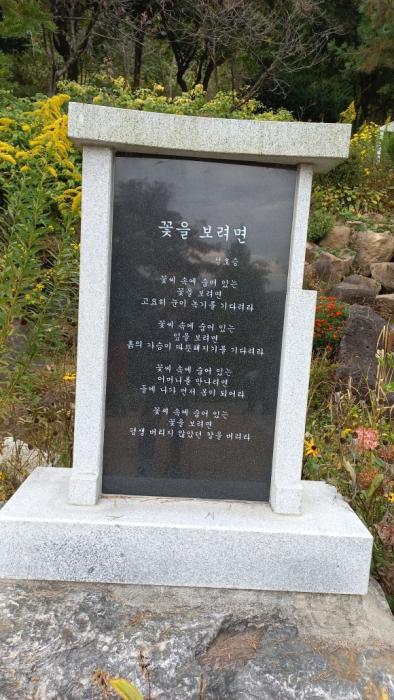 종자 박물관의 씨앗들을 본 후, 정원에 있는 유명, 무명 시인들 시비를 감상했다. 이곳에 자리한 40여 기의 문인들 작품은 후세에까지 오래오래 남을 것이다. 문인들의 로망인 자신의 시가 시비(詩碑)로 세워진다는 것은 큰 영광이다.