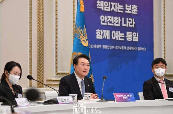 [뉴스시선집중, 이학범기자] 윤석열 대통령은 1. 27일 오전 청와대 영빈관에서 통일부, 행정안전부, 국가보훈처, 인사혁신처로부터 2023년 정책방향 보고를 보고 받았다. ‘책임지는 보훈, 안전한 나라, 함께 여는 통일’ 이라는 슬로건 아래 진행된 이 날 보고에는 권영세 통일부 장관, 이상민 행정안전부 장관, 박민식 국가보훈처장, 김승호 인사혁신처장을 비롯한 부처 실?국장, 민간 전문가, 정책수요자 등 160여 명이 참석했다.